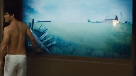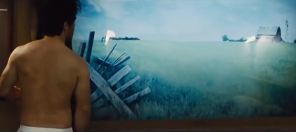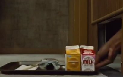 When Joe first wakes up in the hotel room, he tries to get out naturally – but finds the room is encased in tough metal. An illuminated poster on the wall shows a general outdoor setting absorbed in daylight, which slides up to reveal a night-time scene once evening arrives. And to prevent him from starving, a small hatch at the bottom of the door opens three times daily – with someone on the outside sliding food through on a tray.