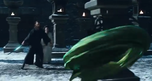 Mizuki turns into a gigantic dragon at one stage. She sweetly strides along the ground as a human, before spinning around on the spot and morphing into something terrifying; as her clothing flaps and swirls, it starts to levitate and then snowballs into one hell of a scary dragon, which then looks down at Kai (Keanu) before swooping in for the kill.