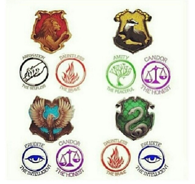 The houses are: Abnegation (selfless), Amity (peaceful), Candor (truthful), Erudite (intelligent) and Dauntless (brave).